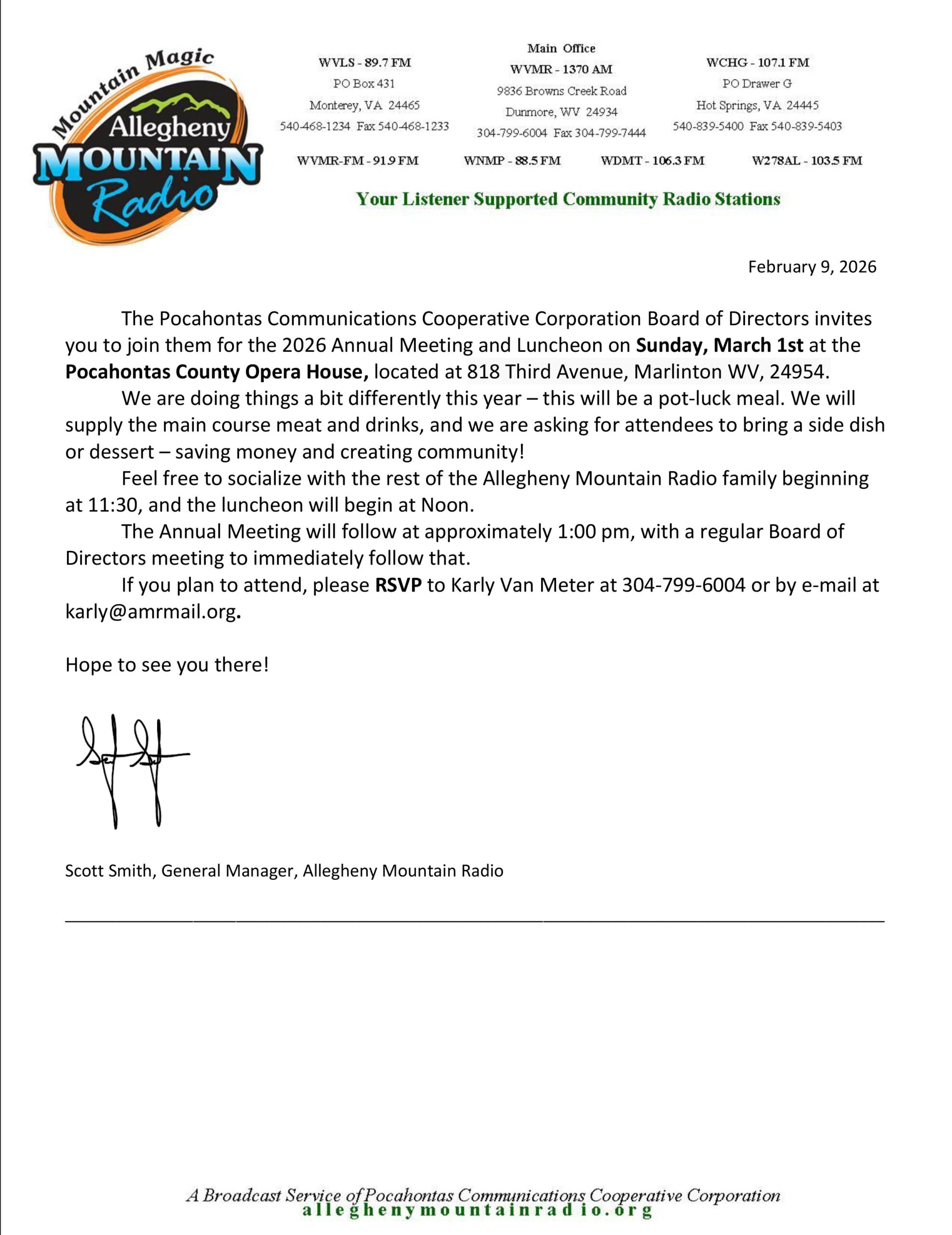 The Pocahontas Communications Cooperative Corporation Board of Directors invites you to join them for the 2026 Annual Meeting and Luncheon on Sunday, March 1st at the Pocahontas County Opera House, located at 818 Third Avenue, Marlinton WV, 24954.
